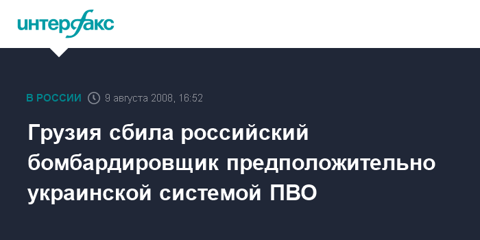 Москва. 9 августа. INTERFAX.RU - Российский бомбардировщик дальнего радиуса действия Ту-22 был сбит над Грузией зенитной ракетой дальнего радиуса действия, предположительно С-200, сообщил Интерфаксу-АВН" в субботу источник в оперативном штабе российской группировки.
