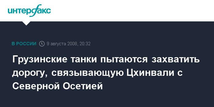 Москва. 9 августа. INTERFAX.RU - Танки вооруженных сил Грузии предпринимают попытки взять контроль над Зарской дорогой, которая связывает Цхинвали с Северной Осетией. Не прекращается огонь по Цхинвали с грузинской стороны.