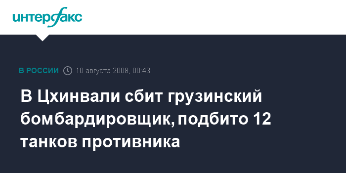 Москва. 10 августа. INTERFAX.RU - Грузинский бомбардировщик сбит и 12 танков подбито в ходе боестолкновений в Цхинвали, сообщает сайт комитета по информации и печати Южной Осетии. "По данным на 23:50 в Цхинвале артиллерийский обстрел стих после пятичасового боя. Танковый штурм предотвращен - на южных окраинах Цхинвала 12 подбитых грузинских танка. Уничтожен один грузинский снайпер и два наводчика. Сбит грузинский бомбардировщик", - говорится в сообщении, размещенном на сайте.