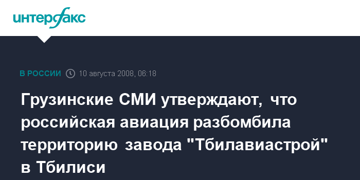 Москва. 10 августа. INTERFAX.RU - Российская авиация разбомбила территорию завода "Тбилавиастрой" в Тбилиси, сообщают в воскресенье местные СМИ. Сведений о пострадавших пока нет. "Интерфакс" не располагает информацией по этому поводу от Минобороны РФ.