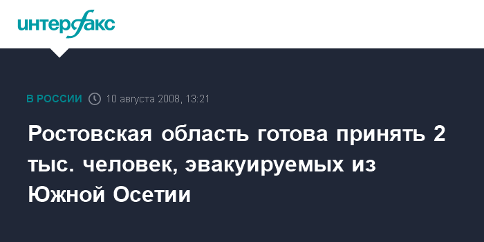 "Наша область готова принять 2 тыс. беженцев из Южной Осетии. Губернатор Ростовской область Владимир Чуб отдал соответствующее распоряжение всем необходимым службам, которые занимаются подготовкой к размещению беженцев", - заявил в интервью агентству "Интерфакс-Юг" в воскресенье заместитель губернатора Ростовской области, председатель комиссии по чрезвычайным ситуациям региона Сергей Назаров.