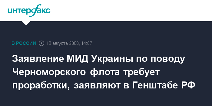 Москва. 10 августа. INTERFAX.RU - Заявление украинского МИДа о том, что кораблям Черноморского флота РФ, которые примут участие в операции по блокаде Грузии, будет запрещено вернуться на базу, требует проработки, считает замначальника Генштаба Вооруженных сил РФ генерал-полковник Анатолий Ноговицын