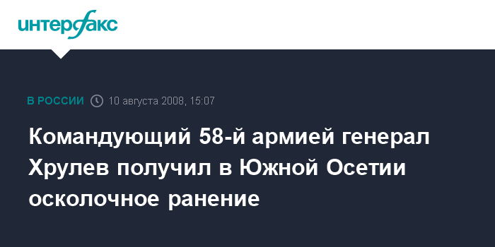 Москва.10 августа. INTERFAX.RU - Командующий 58-й армией Северокавказского военного округа генерал-лейтенант Анатолий Хрулев был ранен осколком и госпитализирован во Владикавказ, сообщил в воскресенье журналистам в Москве заместитель начальника российского Генштаба, генерал-полковник Анатолий Ноговицын.