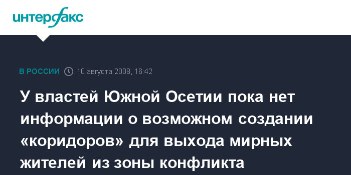 Цхинвали. 10 августа. INTERFAX.RU - Власти Южной Осетии не располагают данными о том, что к вечеру воскресенья могут быть созданы так называемые "коридоры" для выхода из зоны конфликта мирных граждан.