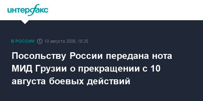Тбилиси. 10 августа. INTERFAX.RU- МИД Грузии в воскресенье вручил консулу Российской Федерации в Грузии Смаге ноту, в которой говорится, что согласно распоряжению президента Грузии от 10 августа, вооруженные силы прекращают огонь в Южной Осетии, сказано в сообщении МИД Грузии, распространенном в воскресенье.