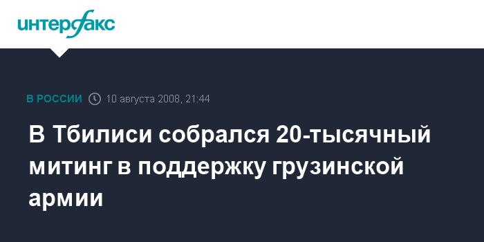 Москва. 10 августа. INTERFAX.RU - Более 20 тысяч человек собрались в воскресенье вечером на Площади Роз в Тбилиси в поддержку грузинской армии, подразделения которой ведут бои в Южной Осетии.