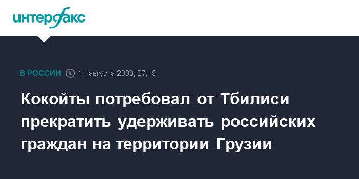 Москва. 11 августа. INTERFAX.RU - Президент Южной Осетии Эдуард Кокойты завил, что в случае, если Грузия не перестанет удерживать российских граждан на своей территории, югоосетинская сторона примет "адекватные меры".