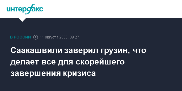 Тбилиси. 11 августа. ИНТЕРФАКС - Президент Грузии Михаил Саакашвили призвал сограждан не поддаваться панике. "Грузинское руководство делает все возможное, чтобы этот кризис завершился как можно быстрее", - сказал Саакашвили, выступая вечером в воскресенье по телевидению с обращением к народу Грузии.