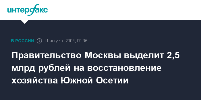 Правительство Москвы выделит 2,5 млрд рублей на восстановление хозяйства Южной Осетии