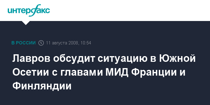 Москва. 11 августа. INTERFAX.RU - Ситуацию в Южной Осетии обсудит глава МИД РФ Сергей Лавров с главами МИД Франции (председательствующей в ЕС) и Финляндии (председательствующей в ОБСЕ) Бернардом Кушнером и Александром Стуббом.
