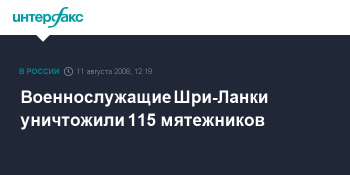 Дели. 11 августа. INTERFAX.RU - Военное командование Шри-Ланки объявило в понедельник об уничтожении за последние дни 115 мятежников из движения "Тигры освобождения Тамил Илама" (ТОТИ) во время боев на севере острова. "Военнослужащими были убиты 60 террористов из движения "Тигры освобождения Тамил Илама", еще 28 мятежников были ранены в результате воскресных столкновений", сообщили в военном командовании вооруженных сил Шри-Ланки.
