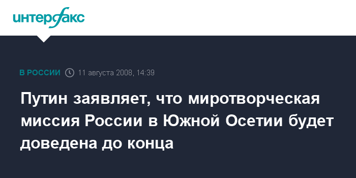 Путин заявляет, что миротворческая миссия России в Южной Осетии будет доведена до конца