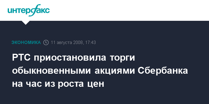 Москва. 11 августа. ИНТЕРФАКС - РТС приостановила торги обыкновенными акциями Сбербанка РФ с 17:30 мск на один час, сообщили агентству "Интерфакс-АФИ" на бирже.