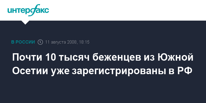 Москва. 11 августа. INTERFAX.RU - Федеральная миграционная служба России зарегистрировала около 10 тысяч беженцев из Южной Осетии, которые получат право российской государственной поддержки.