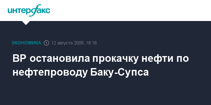 Москва. 12 августа. INTERFAX.RU - BP-Azerbaijan приостановила прокачку нефти по нефтепроводу Баку-Супа, связывающему Азербайджан с грузинским побережьем Черного моря, сообщили агентству "Интерфакс-Азербайджан" в пресс-службе компании.