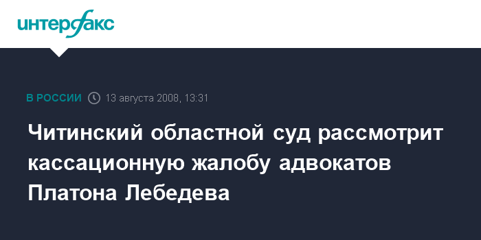 Чита. 13 августа. INTERFAX.RU - Читинский областной суд в четверг приступит к рассмотрению кассационной жалобы адвокатов бывшего руководителя МФО "МЕНАТЕП" Платона Лебедева на постановление суда Центрального района города Читы.