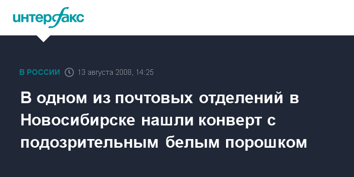 Москва. 13 августа. INTERFAX.RU - В Новосибирске в пятом почтовом отделении при сортировке писем нашли конверт с подозрительным белым порошком.