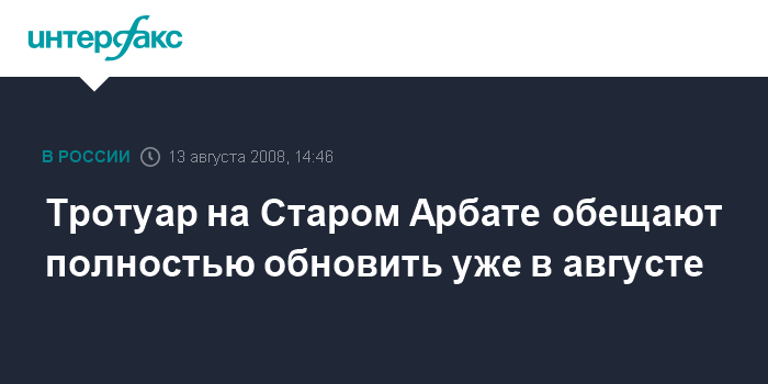 Москва. 13 августа. INTERFAX.RU - Замена тротуарного покрытия на Старом Арбате будет полностью завершена к 25 августа, сообщил руководитель департамента жилищно-коммунального хозяйства и благоустройства столицы Андрей Цыбин на пресс-конференции в центральном офисе "Интерфакса" в среду.