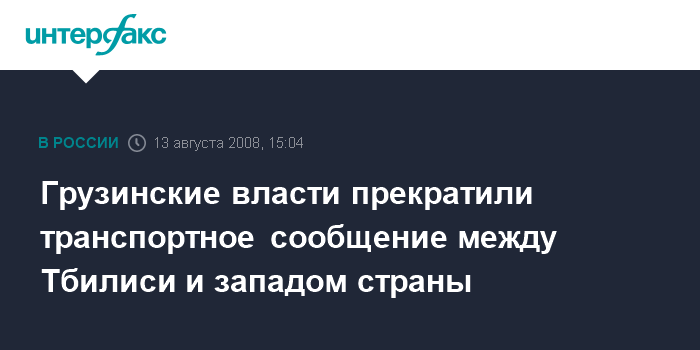 Тбилиси. 13 августа. INTERFAX.RU - Автомобильное движение из Тбилиси в сторону западной Грузии перекрыто. "Это было сделано в целях безопасности в связи с вводом в среду в Гори российской бронетехники", - заявил журналистам начальник патрульной полиции Тбилиси Георгий Гегечкори. Он добавил, что сроки возобновления движения на центральной автомагистрали, связывающей Тбилиси с западной Грузией, пока не известны.