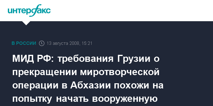 Москва. 13 августа. INTERFAX.RU - Требования Грузии о прекращении миротворческой операции в Абхазии может являться попыткой подготовить новую вооруженную авантюру против этой непризнанной республики, заявляет МИД РФ.