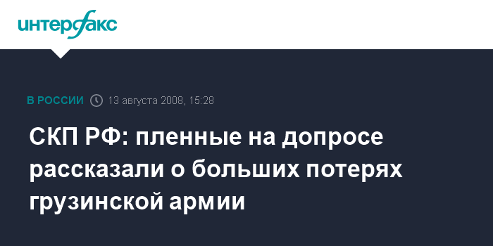 Владикавказ. 13 августа. INTERFAX.RU - В ходе допроса два грузинских военнослужащих сообщили, что грузинская армия понесла большие потери в ходе конфликта в Южной Осетии, заявил журналистам во Владикавказе официальный представитель СКП при прокуратуре РФ Владимир Маркин.