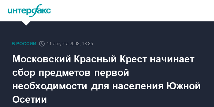 Москва. 11 августа. INTERFAX.RU - В связи с вооруженным конфликтом и большим количеством пострадавших от военных действий грузинских войск Московский Красный Крест (МКК) начал сбор предметов первой необходимости для оказания помощи пострадавшим жителям Южной Осетии, находящимся в зоне военного конфликта, а также прибывающим в Северную Осетию и близлежащие регионы РФ.