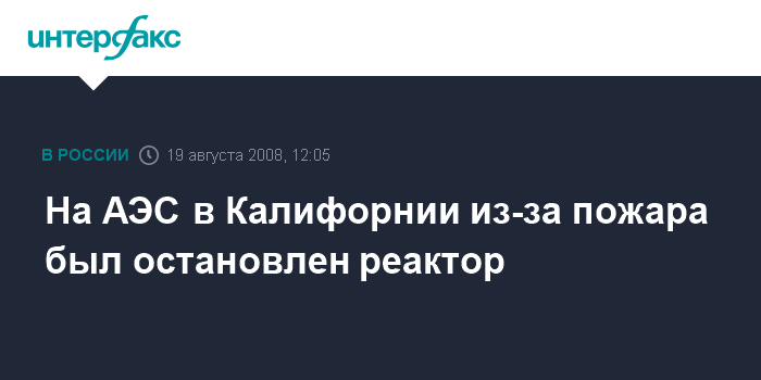 Москва. 19 августа. INTERFAX.RU - Один из двух реакторов на атомной электростанции "Диабло" в Калифорнии (США) был остановлен после возгорания трансформатора, сообщила газета Los Angeles Daily News. По словам представителя руководства АЭС, угрозы утечки радиации не было, поскольку пожар произошел в неядерной зоне реактора.