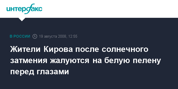 Москва. 19 августа. INTERFAX.RU - Спустя две недели после солнечного затмения 1 августа шесть жителей Кирова были госпитализированы в офтальмологическую поликлинику с ожогами сетчатки. "Люди стали приходить 3 и 4 августа с жалобами на белую пелену в глазах и резкое снижение зрения. Сейчас в стационаре на лечении находятся шесть человек с диагнозом "ожог сетчатки глаз с отеком". За последнюю неделю обратилось еще 10 граждан с аналогичными симптомами", - сообщила агентству "Интерфакс" заместитель главного врача офтальмологической поликлиники Татьяна Сысолятина.