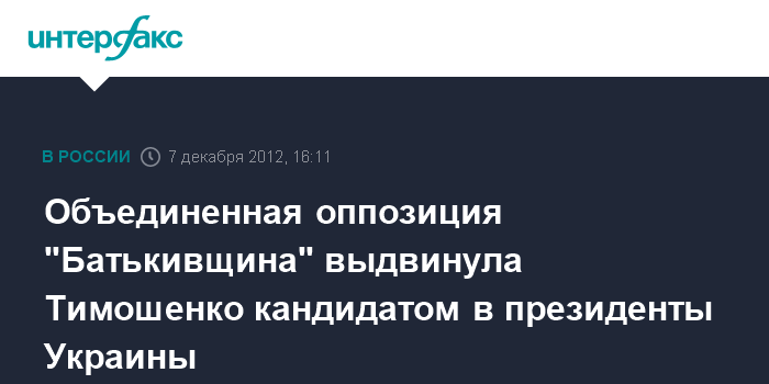 Киев. 7 декабря. INTERFAX.RU - Объединенная оппозиция "Батькивщина" выдвинула лидера партии "Батькивщина" Юлию Тимошенко единым кандидатом на президентских выборах. Такое решение было принято в пятницу на расширенном заседании совета "Батькивщины".