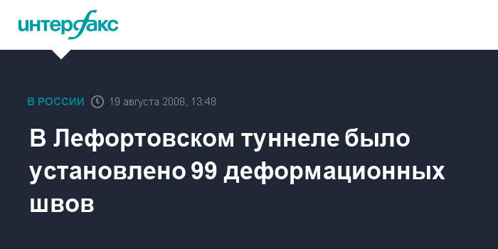 Москва. 19 августа. INTERFAX.RU - За время закрытия движения по Лефортовскому туннелю в Москве в нем было установлено 99 деформационных швов, сообщил "Интерфаксу" во вторник генеральный директор компании Сергей Овсянников.
