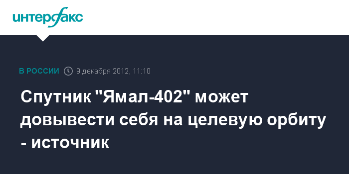 Москва. 9 декабря. INTERFAX.RU - Ситуация с российским космическим аппаратом "Ямал-402" не критична, и он может довывести себя на целевую орбиту с помощью собственных двигателей, сообщил "Интерфаксу-АВН" источник в ракетно-космической отрасли. "Ситуация неприятная, но не катастрофическая. Возможно довыведение спутника на заданную орбиту с помощью его собственных двигателей", - сказал собеседник агентства.