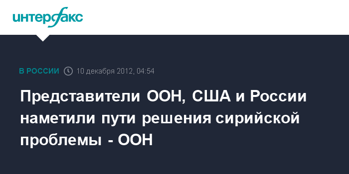Нью-Йорк (ООН). 10 декабря. ИНТЕРФАКС - Прошедшие в Женеве в воскресенье консультации по сирийской проблеме между спецпредставителем ООН и ЛАГ Лахдаром Брахими, замминистра иностранных дел РФ Михаилом Богдановым и заместителем госсекретаря США Уильямом Бернсом можно охарактеризовать как конструктивные, считают в ООН.