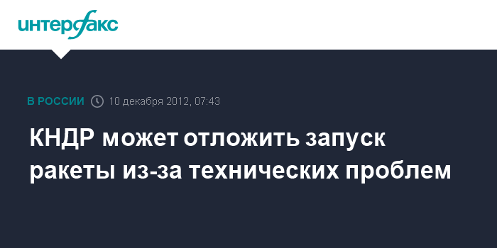 Сеул. 10 декабря. INTERFAX.RU - Запуск ракеты-носителя со спутником, который КНДР планировала произвести в период с 10 по 22 декабря, задерживается из-за технических проблем с третьей ступенью ракеты-носителя, сообщает южнокорейская газета The Chosun Ilbo в понедельник.