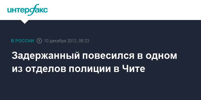 Чита. 10 декабря. INTERFAX.RU - В отделе полиции "Ингодинский" УМВД России по городу Чите задержанный повесился на поясном шнурке от трико, сообщает пресс-служба УМВД по Забайкальскому краю.