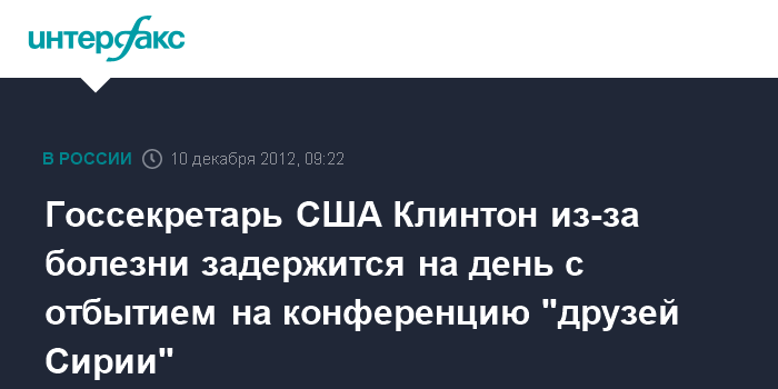 Вашингтон. 10 декабря. INTERFAX.RU - Госсекретарь Хиллари Клинтон перенесла свой вылет в Марокко для участия в конференции так называемых "друзей Сирии" с понедельника на вторник из-за желудочно-кишечной вирусной инфекции, заявил представитель госдепартамента США в воскресенье.