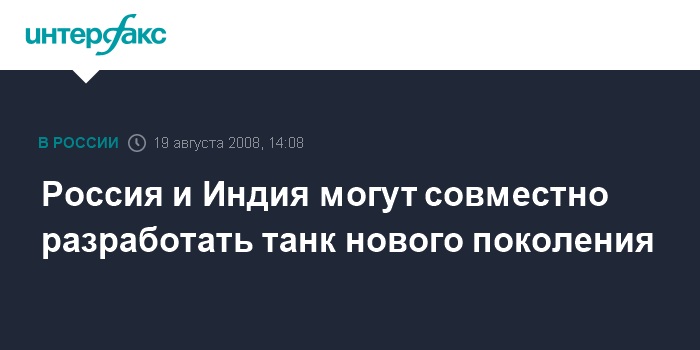 Москва. 19 августа. INTERFAX.RU - Россия и Индия обсуждают возможность совместной разработки танка нового поколения, сообщил журналистам старший инспектор Организации оборонных исследований и развития министерства обороны Индии Сиватхану Пиллаи.