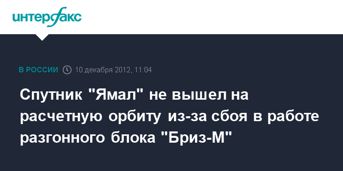 Москва. 10 декабря. ИНТЕРФАКС-АВН - Причиной нештатной работы разгонного блока "Бриз-М", который в воскресенье не смог вывести на нужную орбиту спутник "Ямал-402", скорее всего, стал отказ маршевого двигателя, сказал "Интерфаксу" в понедельник информированный источник в космической отрасли.