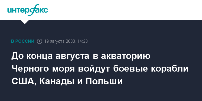 Москва. 19 августа. INTERFAX.RU - По данным российского Генштаба, до конца августа этого года в акваторию Черного моря запланирован ввод боевых кораблей США, Канады и Польши.