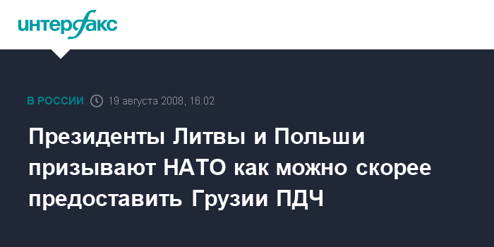 Вильнюс. 19 августа. INTERFAX.RU - Президенты Литвы и Польши Валдас Адамкус и Лех Качиньский опубликовали совместную декларацию, в которой призвали руководителей стран НАТО дать указание министрам иностранных дел рассмотреть возможность скорейшего предоставления Грузии и Украине плана действий для членства (ПДЧ) в альянсе.