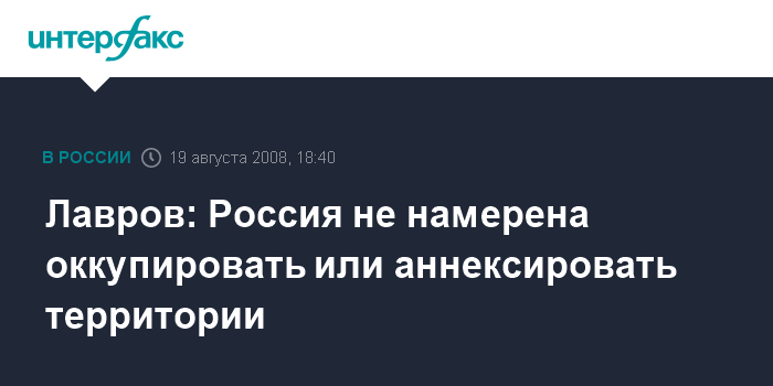 Москва. 19 августа. INTERFAX.RU - Россия, участвуя в урегулировании грузино-югоосетинского конфликта, не собирается аннексировать никаких территорий, заявил глава МИД РФ Сергей Лавров.