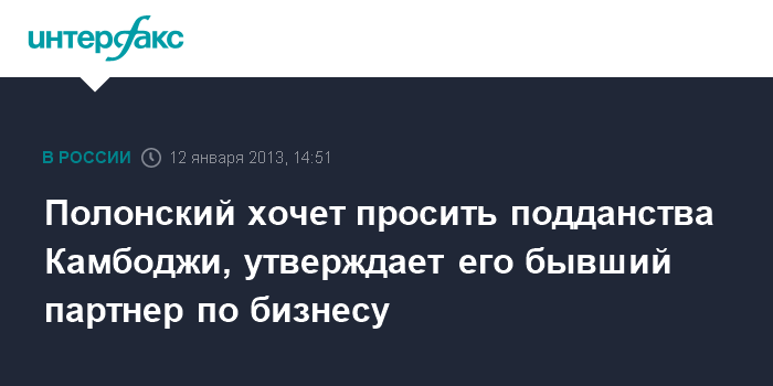 Пномпень/Москва. 12 января. INTERFAX.RU - Российский бизнесмен Сергей Полонский намерен после освобождения из камбоджийской тюрьмы просить подданства королевства Камбоджи, сообщил "Интерфаксу" в субботу по телефону бывший партнер бизнесмена по зарубежным проектам Сергей Влади.