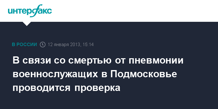Москва. 12 января. INTERFAX.RU - Военные прокуроры проводят проверку в связи со смертью от пневмонии военнослужащих в Подмосковье, командованию внесено представление, ряду военных чиновников объявлено предостережение, сообщили "Интерфаксу" в Главной военной прокуратуре в субботу. "К настоящему времени уже установлено, что заболеванию военнослужащих в московском регионе способствовали нарушения со стороны командования воинских частей, где проходили военную службу скончавшиеся военнослужащие", - заявил представитель ГВП.