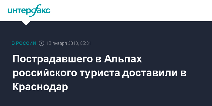Краснодар. 13 января. ИНТЕРФАКС-ЮГ - Пострадавший во время аварии снегохода в Альпах житель Кубани доставлен в Краснодар, сообщили агентству "Интерфакс-Юг" в министерстве курортов и туризма Краснодарского края в воскресенье.