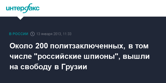 Тбилиси. 13 января. INTERFAX.RU - Широкомасштабная амнистия заключенных в Грузии вступила в силу. С утра в воскресенье были освобождены 190 заключенных осужденных по политических признакам/ Среди освобожденных - и члены выявленной бывшими властями Грузии так называемой "сети российских шпионов" - Рубен Шикоян, Тариель Абашидзе, Гела Какабадзе, Вячеслав Плужников и другие.