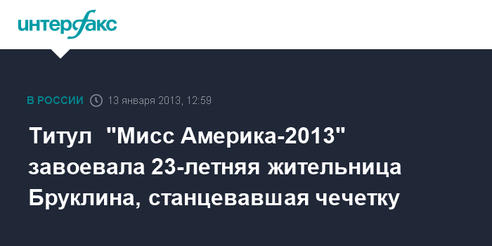 Москва. 13 января. INTERFAX.RU – Титул прошедшего накануне ночью в в Лас-Вегасе ежегодного конкурса красоты "Мисс Америка-2013" получила 23-летняя Мэллори Хэйган.