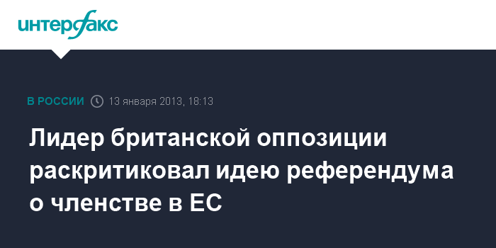 Лондон. 13 января. INTERFAX.RU - Лидер находящихся в оппозиции лейбористов Эд Милибэнд подверг критике идею премьера Великобритании Дэвида Кэмерона провести референдум, чтобы решить, стоит ли стране оставаться в ЕС, пишет в воскресенье газета "Дейли телеграф". "Нам не нужно такое делать. Это противоречит интересам Великобритании", - сказал Э.Милибэнд. По его мнению, Д.Милибэнд "словно лунатик движется в сторону выхода из ЕС".