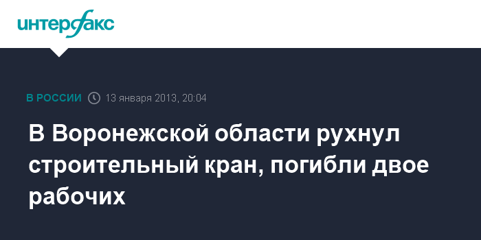 Воронеж. 13 января. ИНТЕРФАКС-ЦЕНТР - В результате падения крана в Борисоглебском районе Воронежской области в воскресенье погибли два человека, сообщили "Интерфаксу" в ГУ МЧС по области.