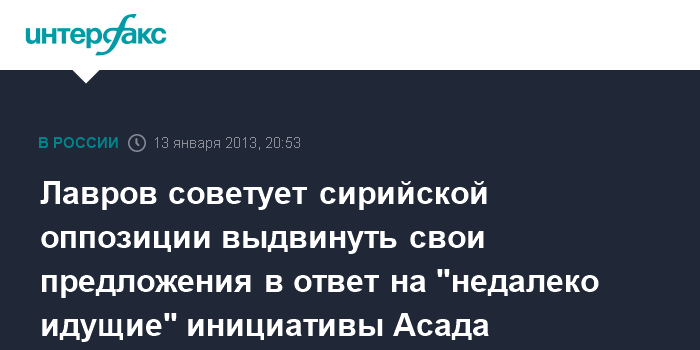 Черновцы (Украина). 13 января. ИНТЕРФАКС - Глава МИД РФ Сергей Лавров считает "недалеко идущими" предложения президента Сирии Башара Асада по налаживанию диалога с оппозицией, однако призывает противников сирийского режима выдвинуть свои идеи по мирному урегулированию.