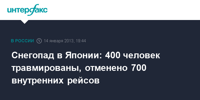 Токио. 14 января. INTERFAX.RU - По меньшей мере, 700 внутренних рейсов были отменены в результате снегопада, обрушавшегося на японскую столицу Токио в понедельник, сообщили в метеорологической службе Японии.