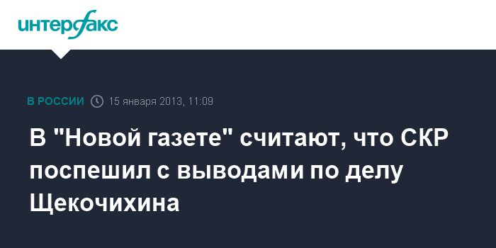 Москва. 15 января. INTERFAX.RU - Главный редактор "Новой газеты" Дмитрий Муратов считает преждевременными выводы Следственного комитата РФ о причинах смерти журналиста Юрия Щекочихина.